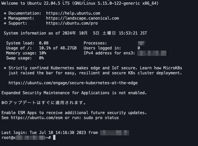 ssh -i ~/.ssh/xserver-vps-key.pem root@ipアドレスそこでここからは、簡単なコマンドでVPSサーバーに接続する設定を行います。