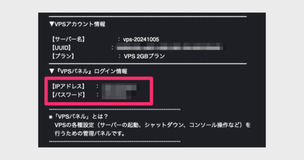 パスワードなどはVPS契約時に送られてくるメールに記載があります。