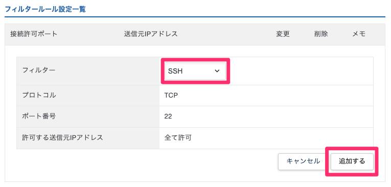 接続許可できる画面が表示されるので、フィルターを「SSH」にして「追加する」ボタンをクリックしましょう。