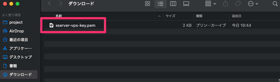 cp /Users/username/Downloads/xserver-vps-key.pem ~/.ssh/続いて、この秘密鍵の権限を設定します。