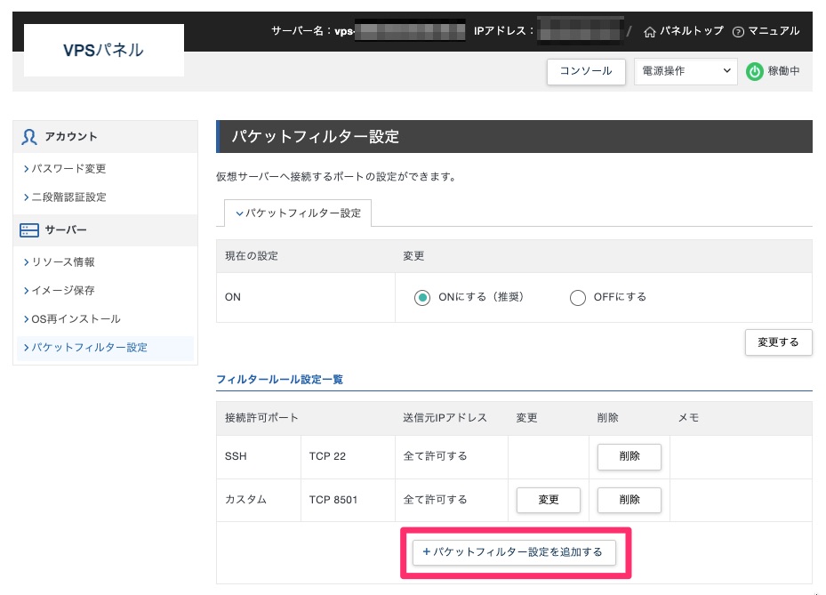 XServer VPSの「パケットフィルター設定」を開きます。