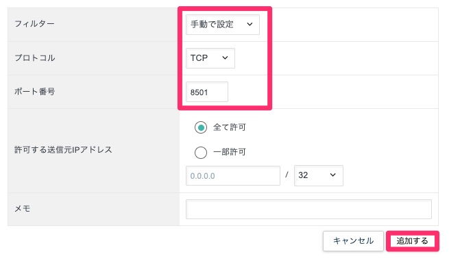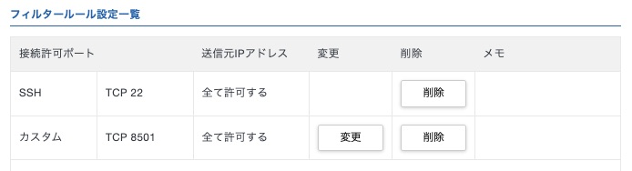 今回はサーバーにSSHログインする際の22番、Streamlitアプリを公開するための8501番を公開します。