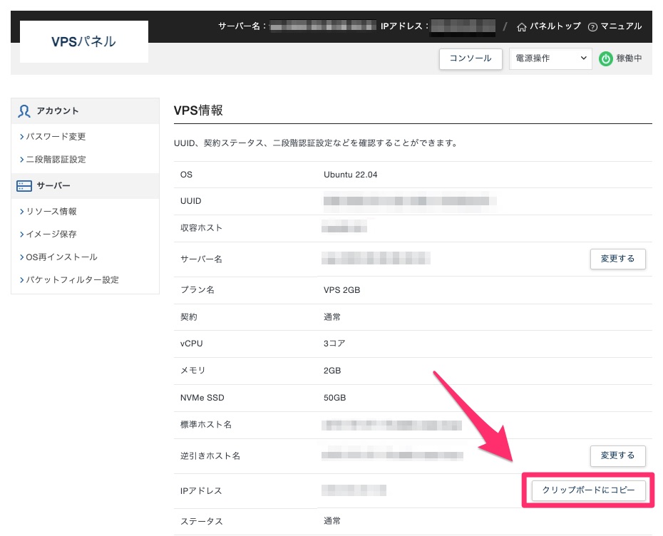 IPアドレスは、「XServer VPSパネル」の「クリップボードにコピーボタン」をクリックすると取得できます。